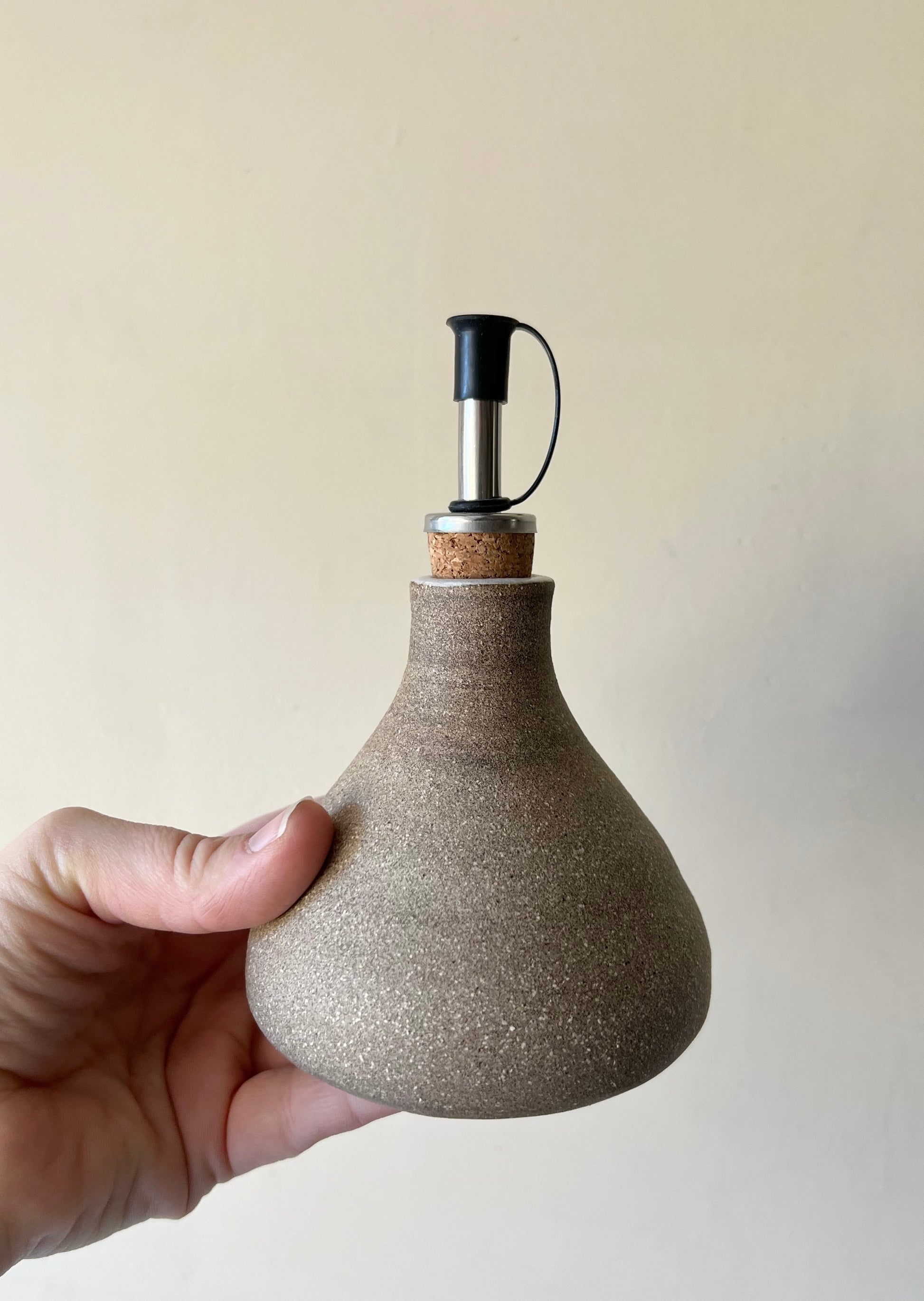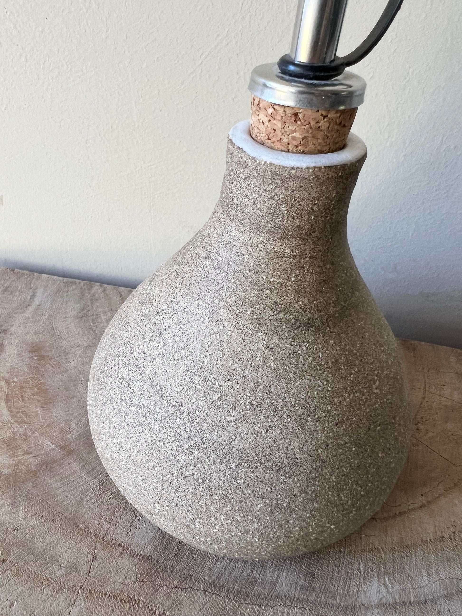 Black clay oil dispenser with bare clay exterior and white interior. Dishwasher safe.