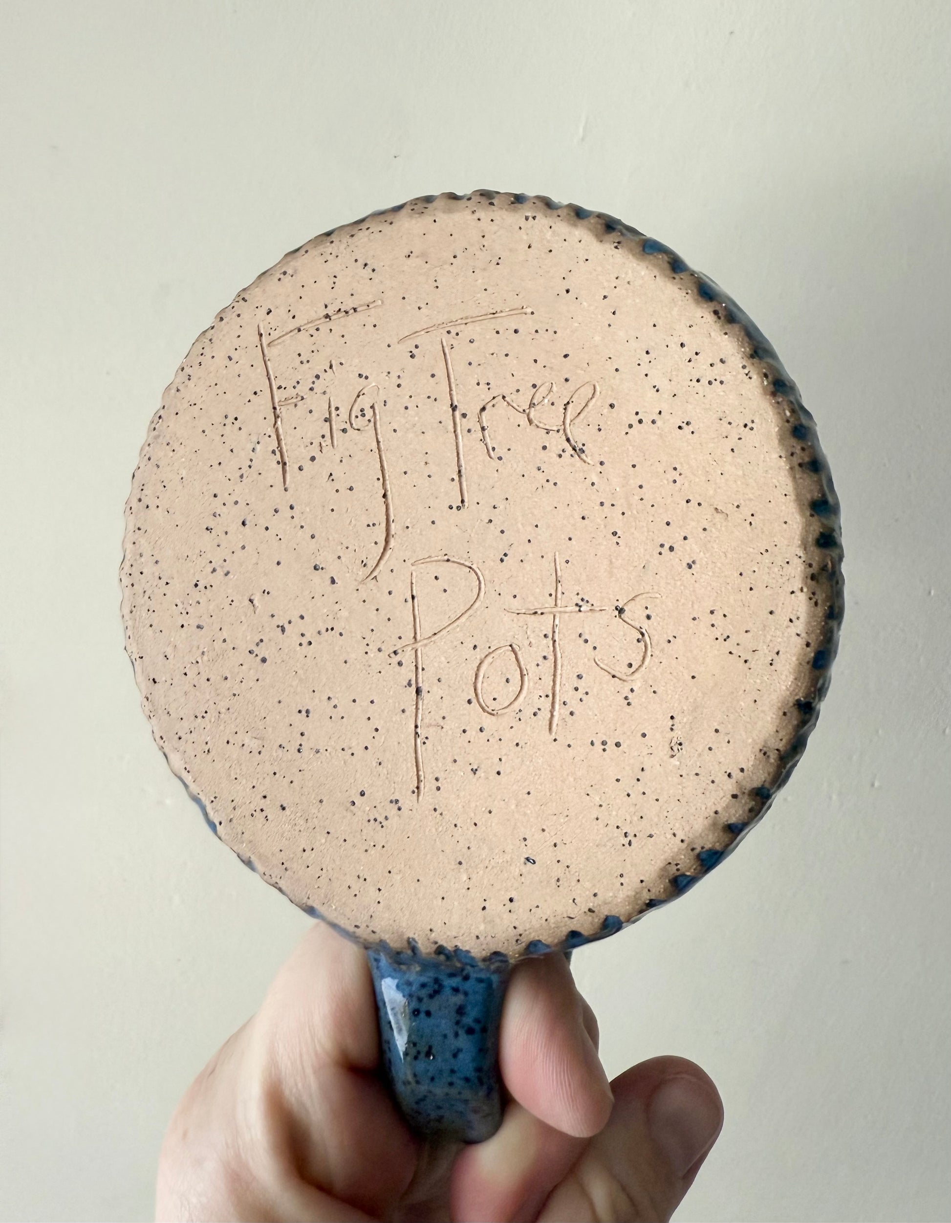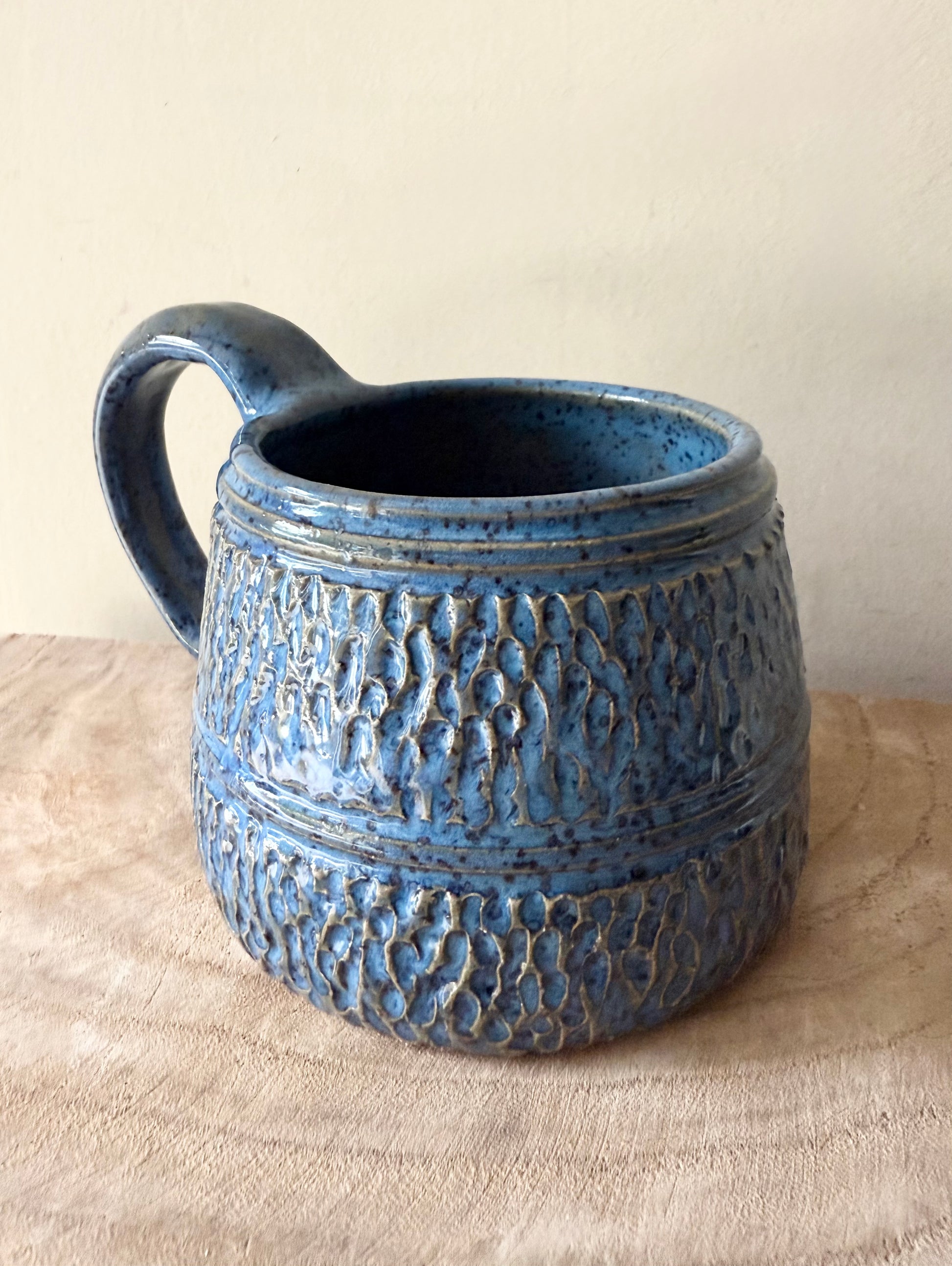 Speckled clay mug with blue glaze and hand carved exterior. Holds 16 ounces.