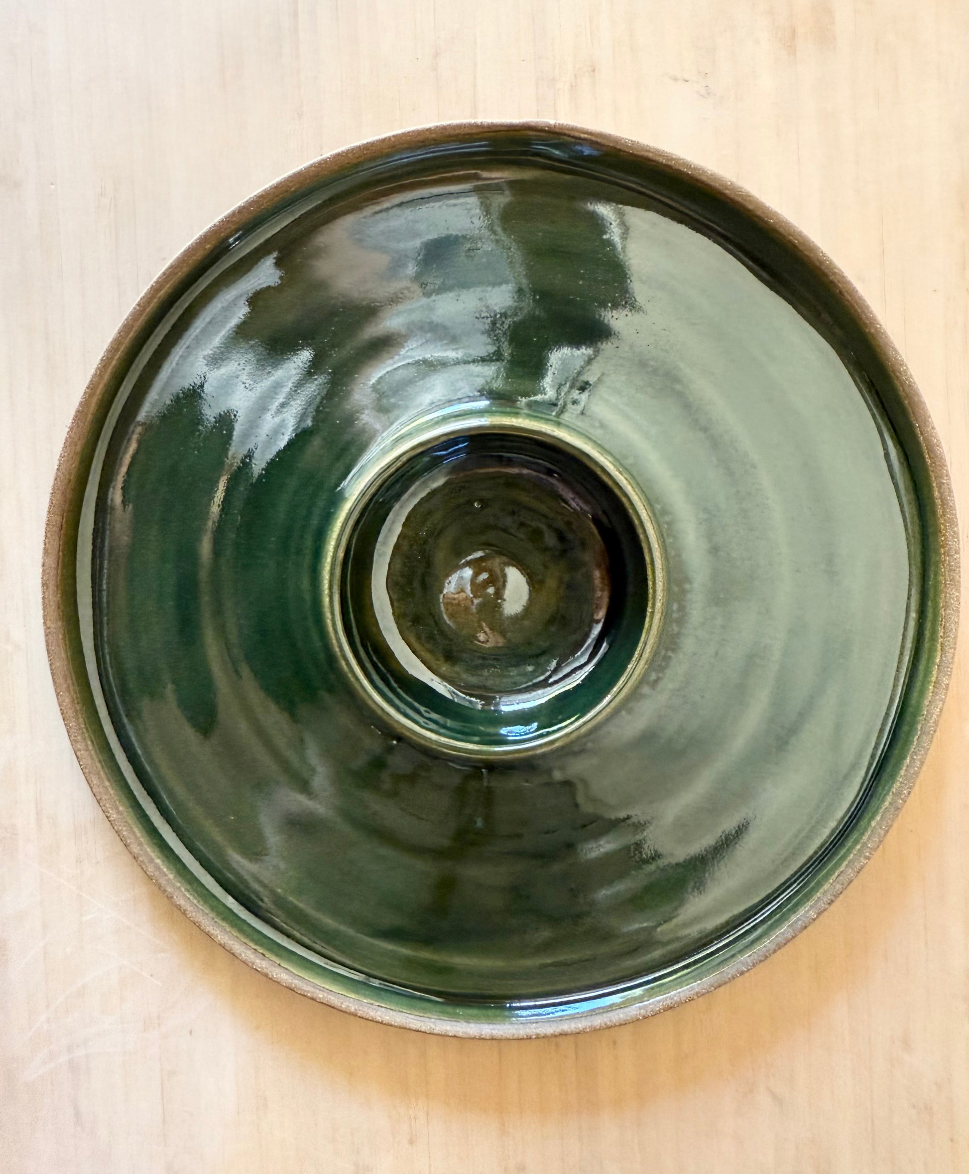 Black clay chip and dip plate with green glaze. Dishwasher and microwave safe.