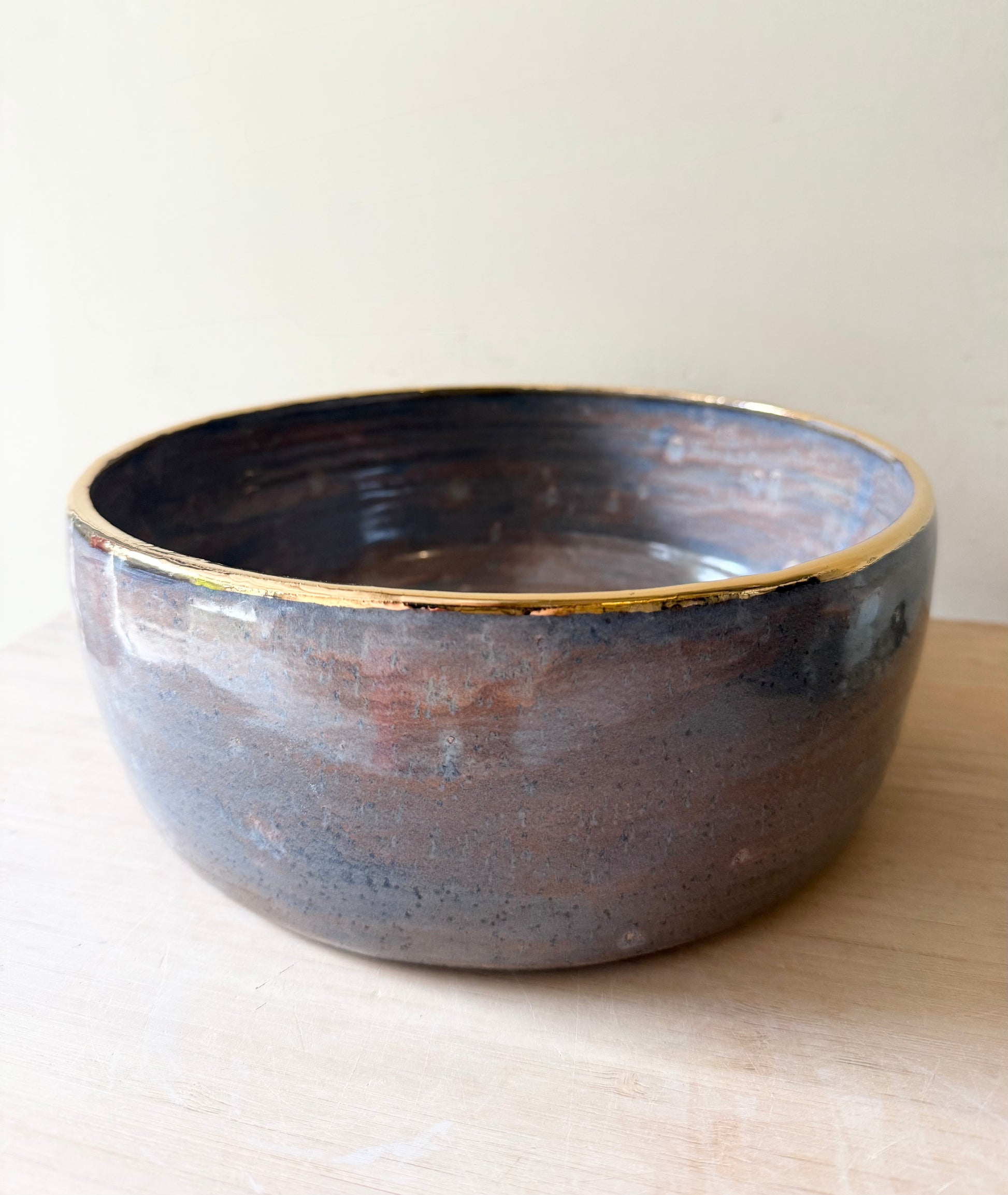 Large black clay serving bowl with mauve and blue glaze and 22K gold luster. Not microwave safe and would recommend hand washing.