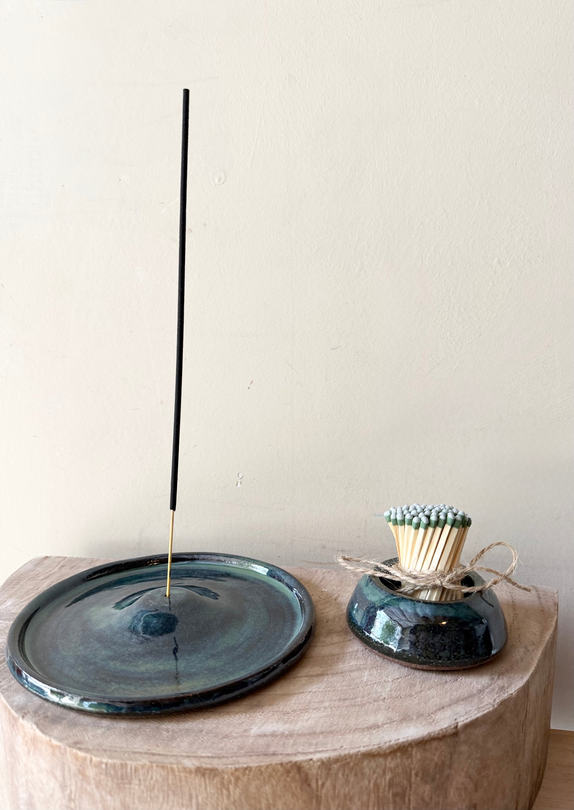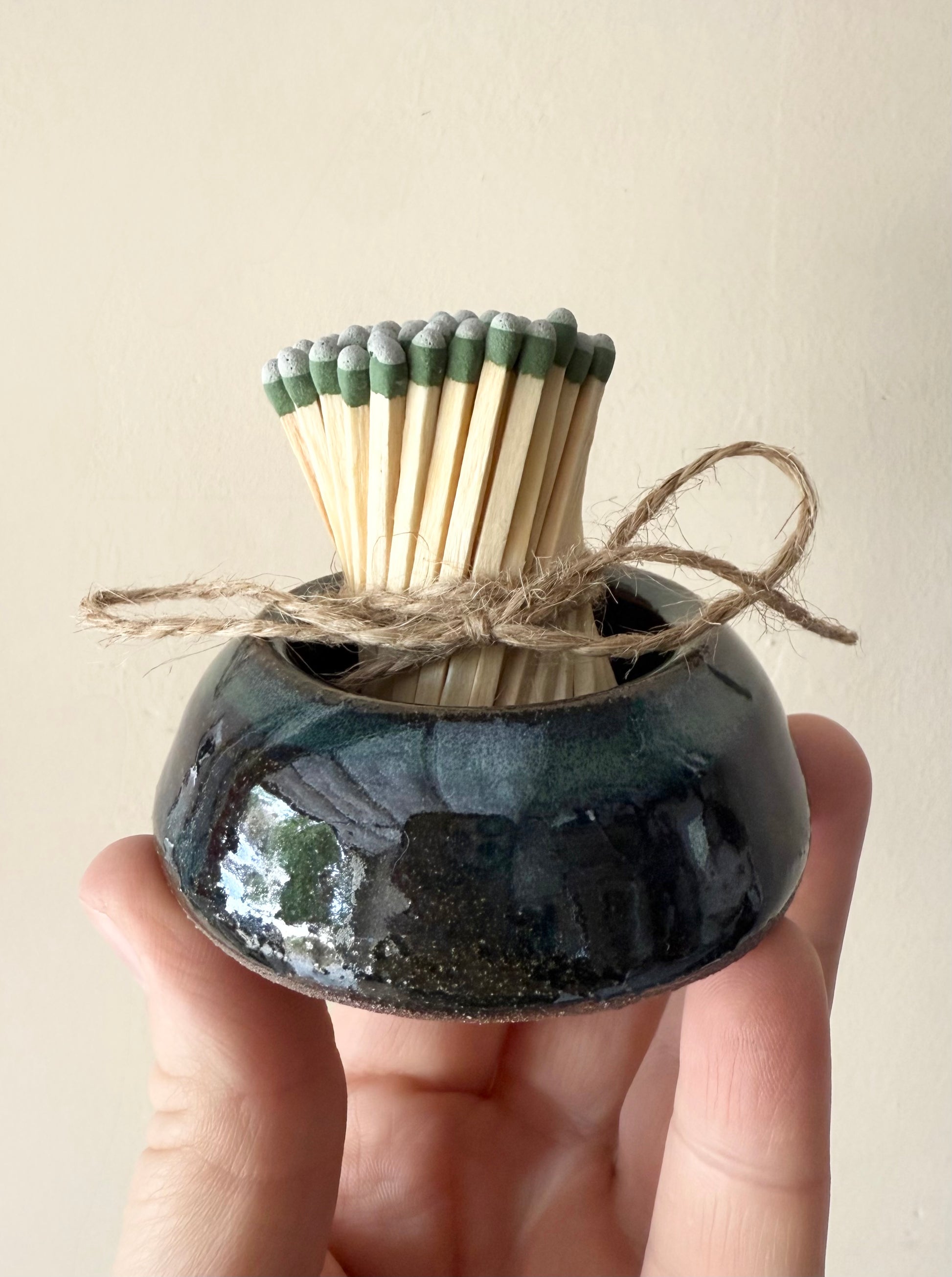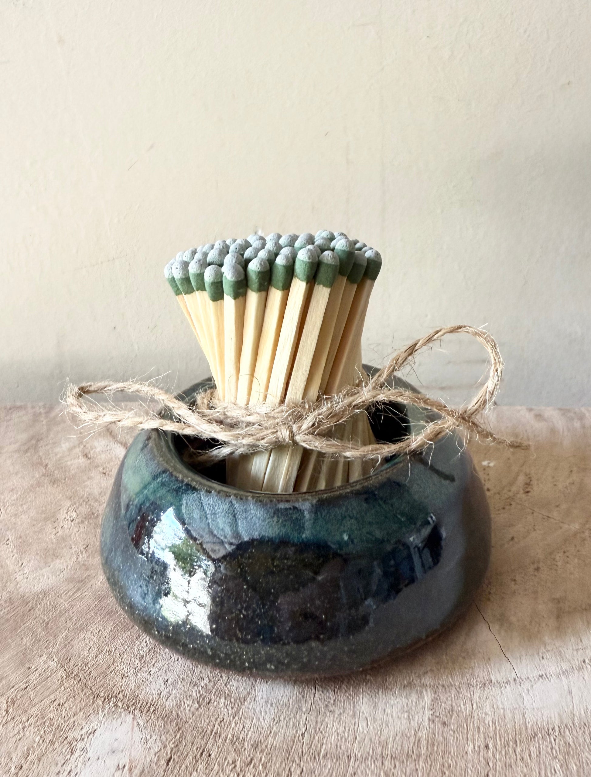 Red clay match striker with green and blue glaze. Includes a bundle of strike anywhere matches.