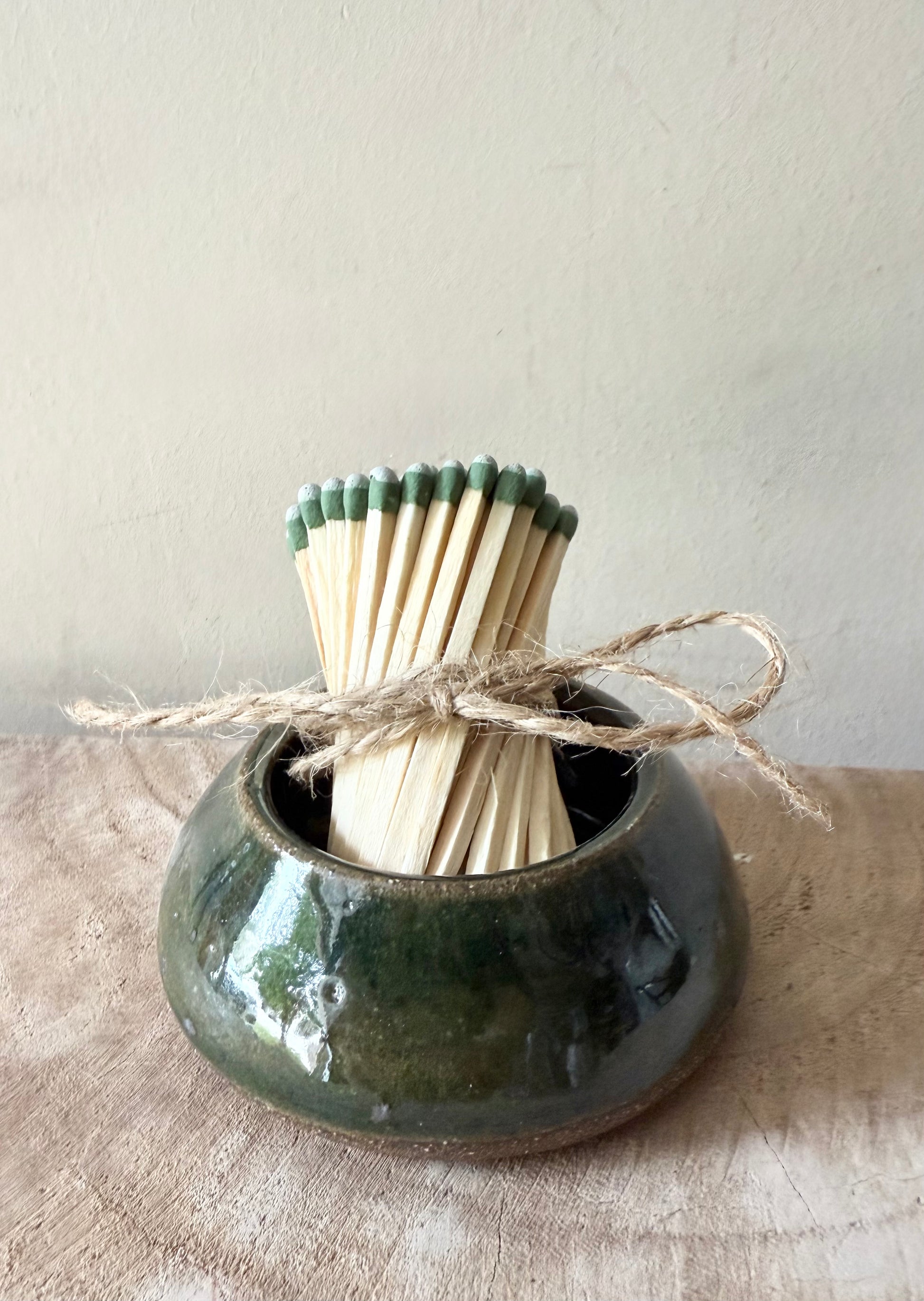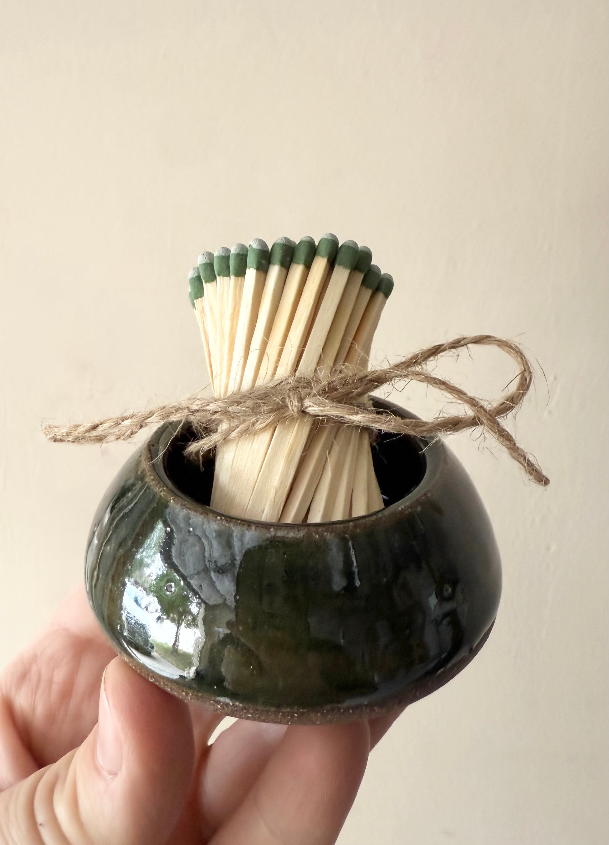 Black clay match striker with green glaze. Includes a bundle of strike anywhere matches.