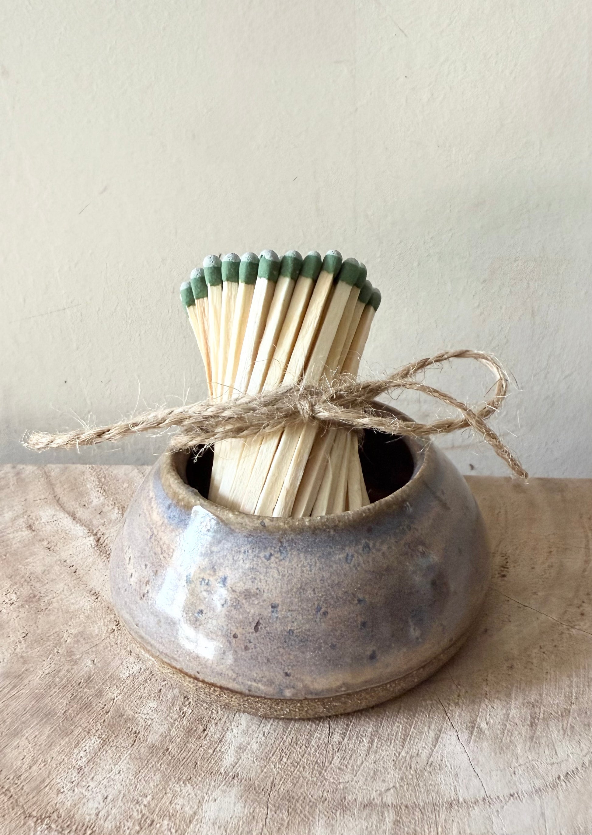 Black clay match striker with layered glaze. Comes with bundle of strike anywhere matches.
