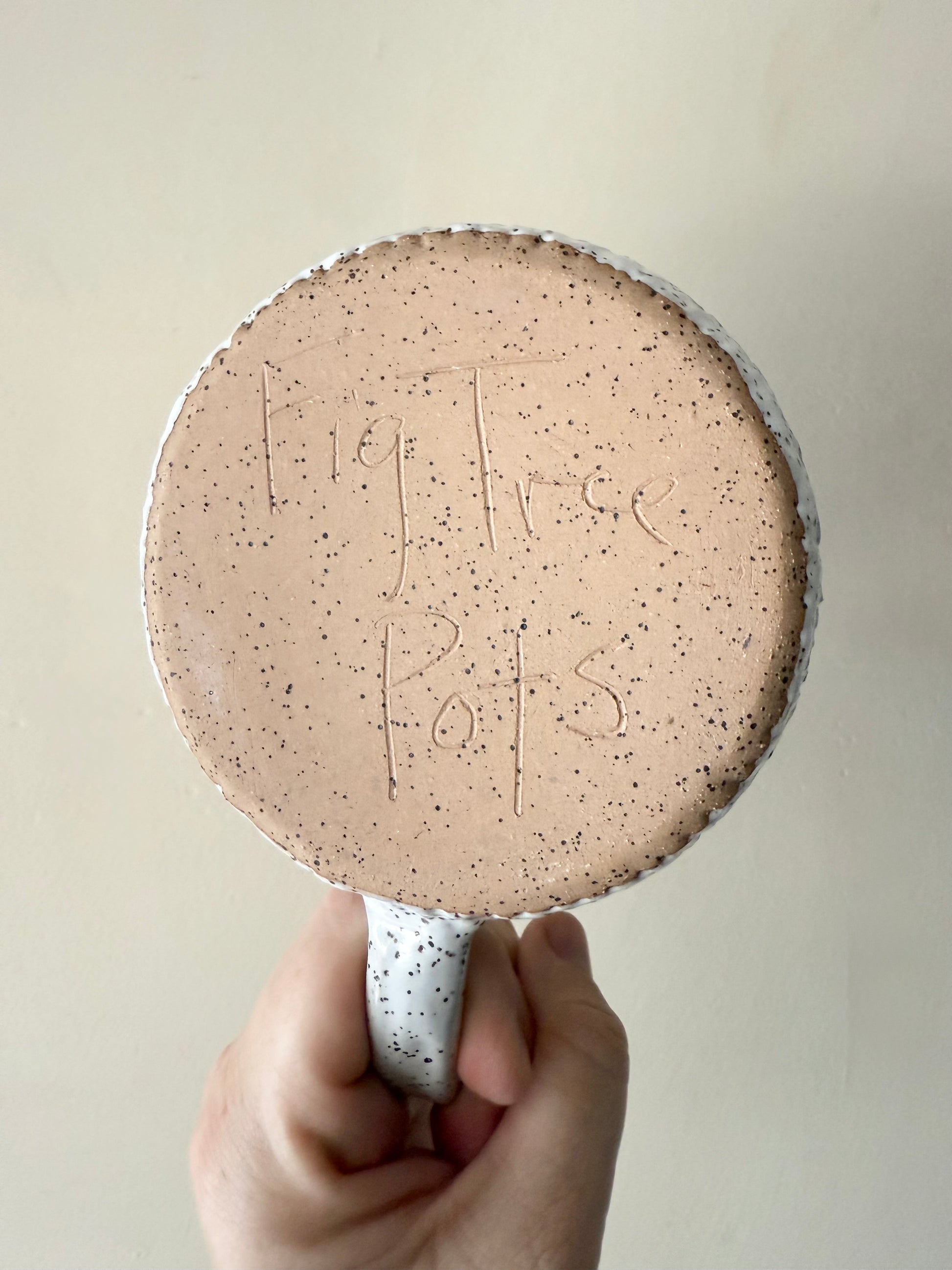 White speckled mug with white glaze and hand carved exterior. Has 22 karat gold rings around top. Holds 18 ounces.