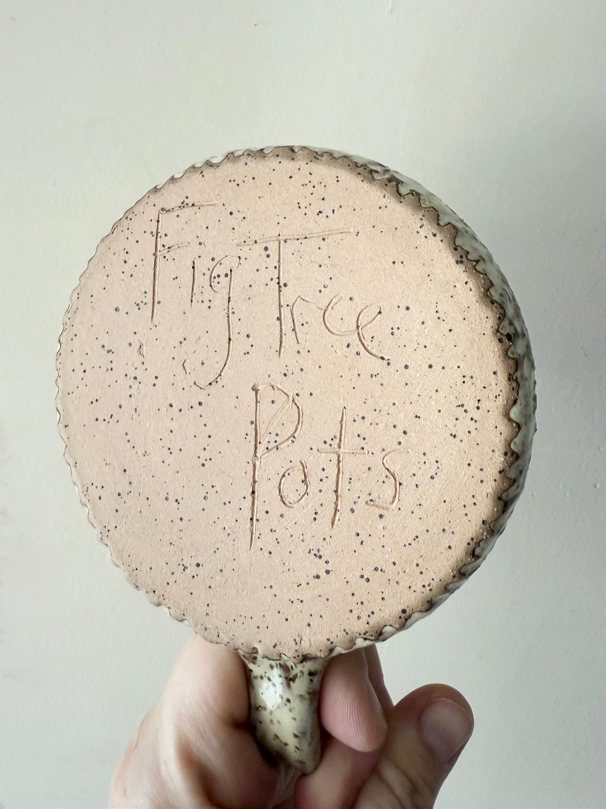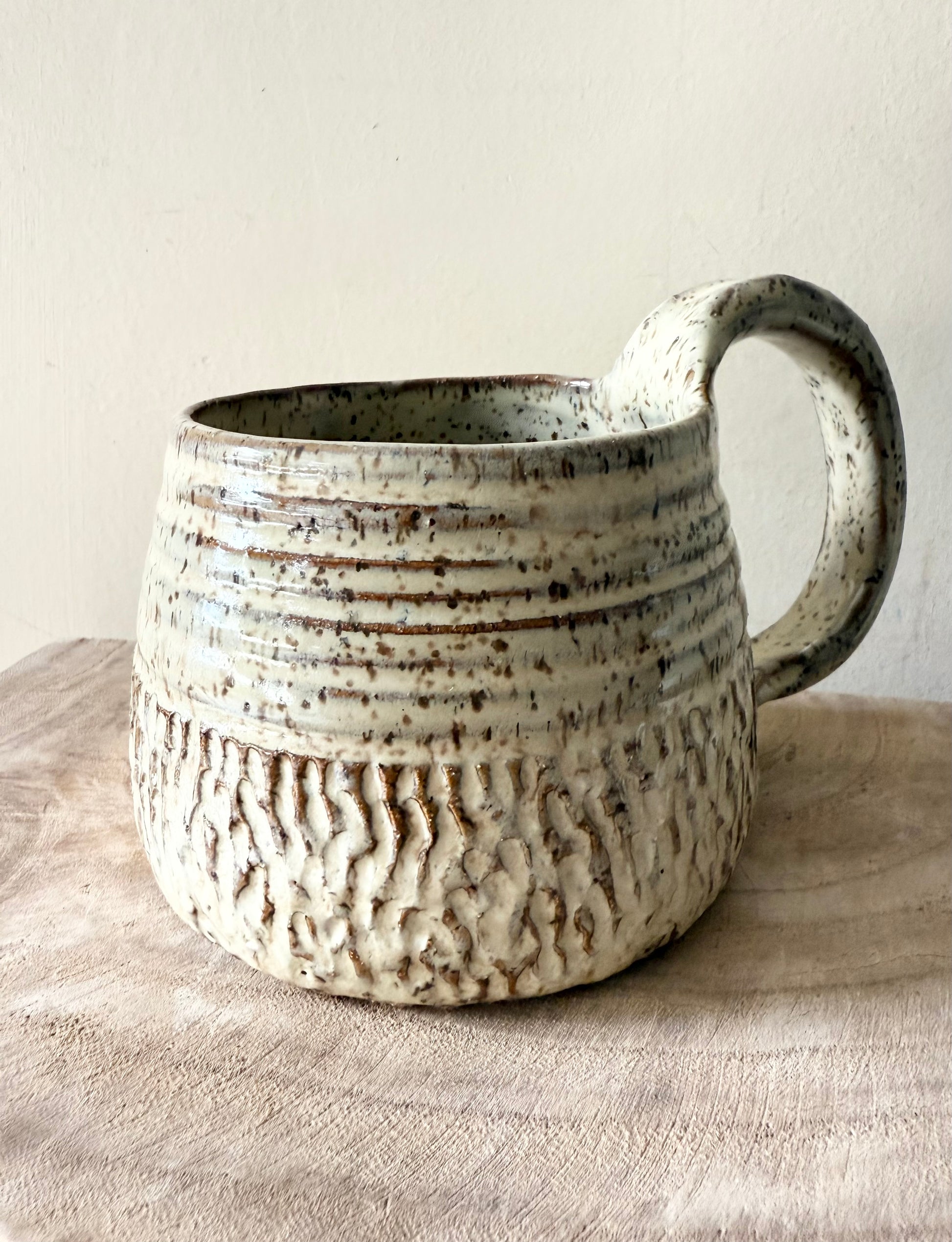 Speckled clay with white glaze and hand carved exterior. Holds 14 ounces.