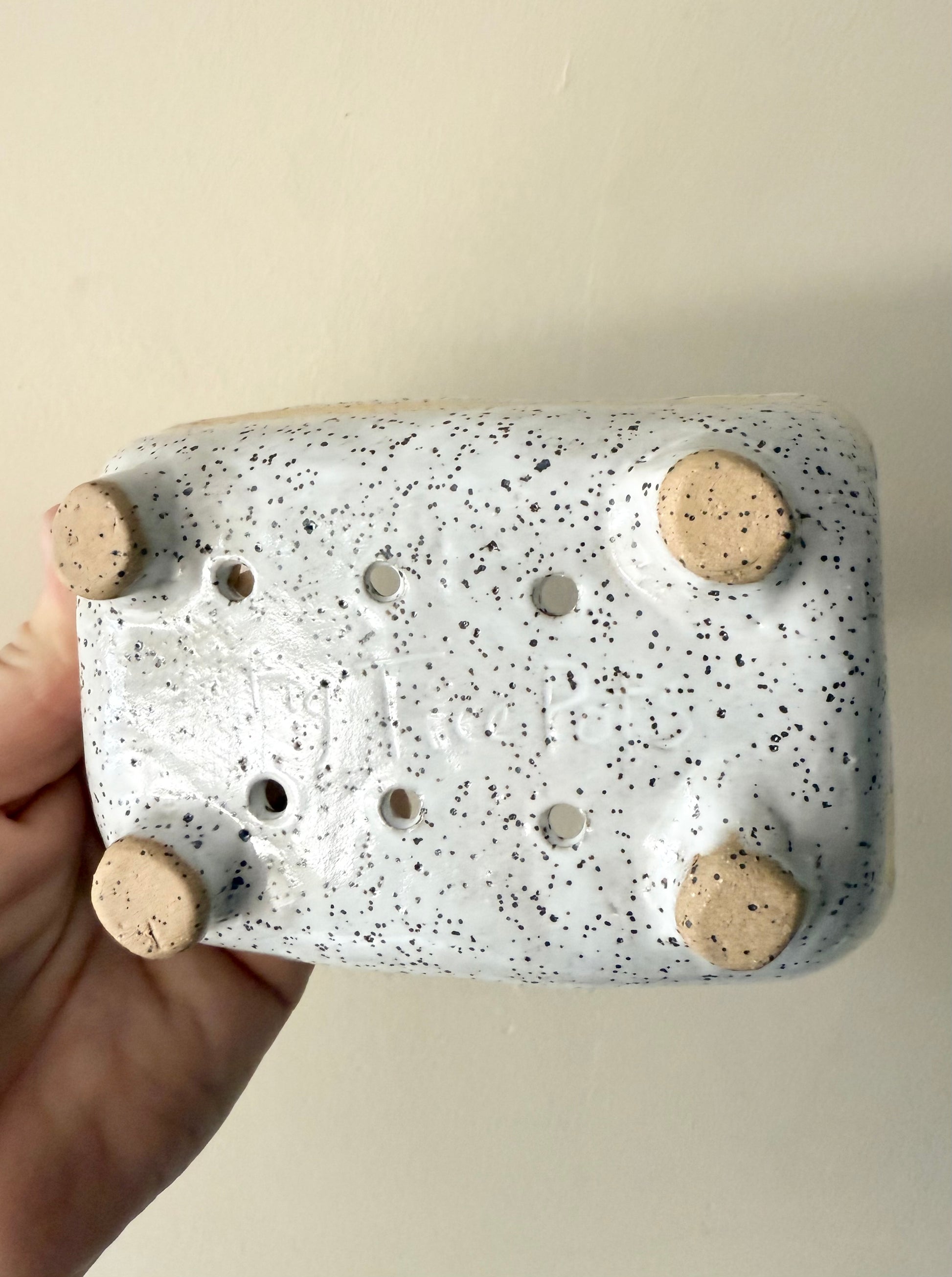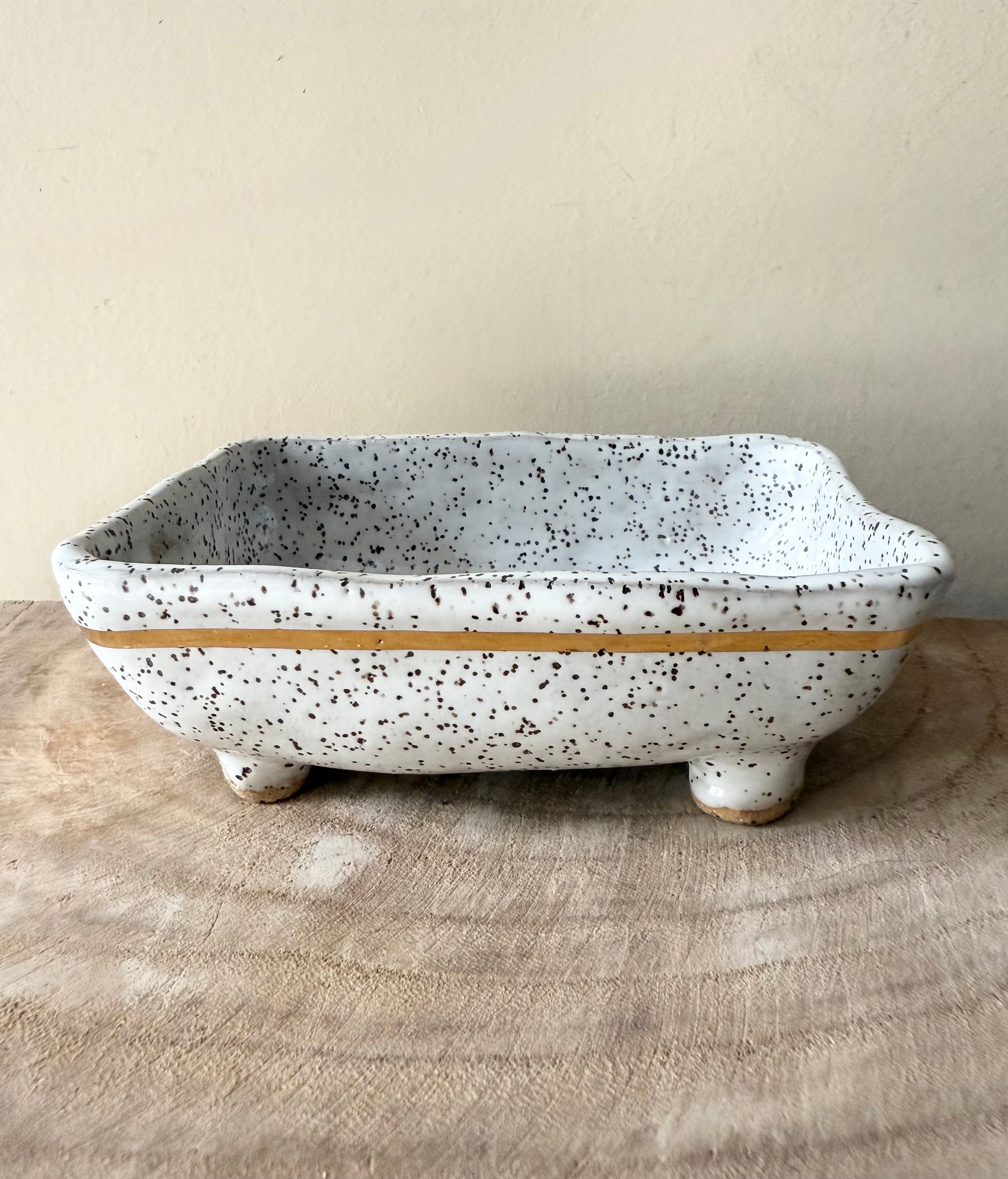 Footed speckled clay soap dish with white glaze and textured interior. Has 22 karat gold strip near top.